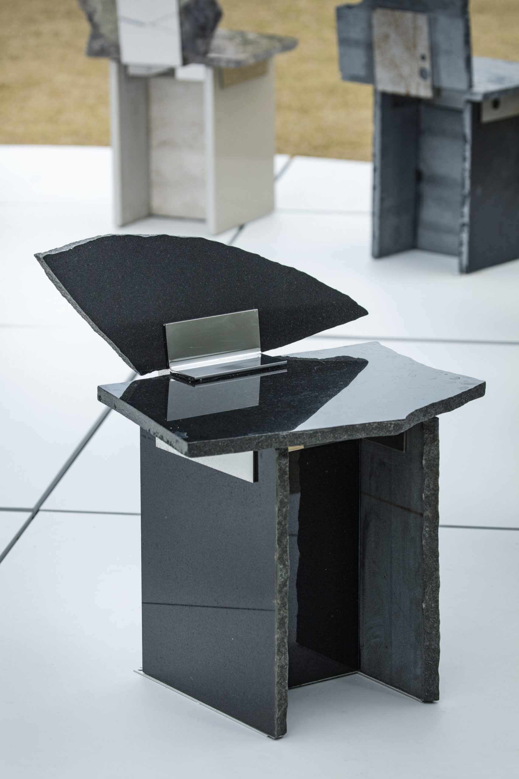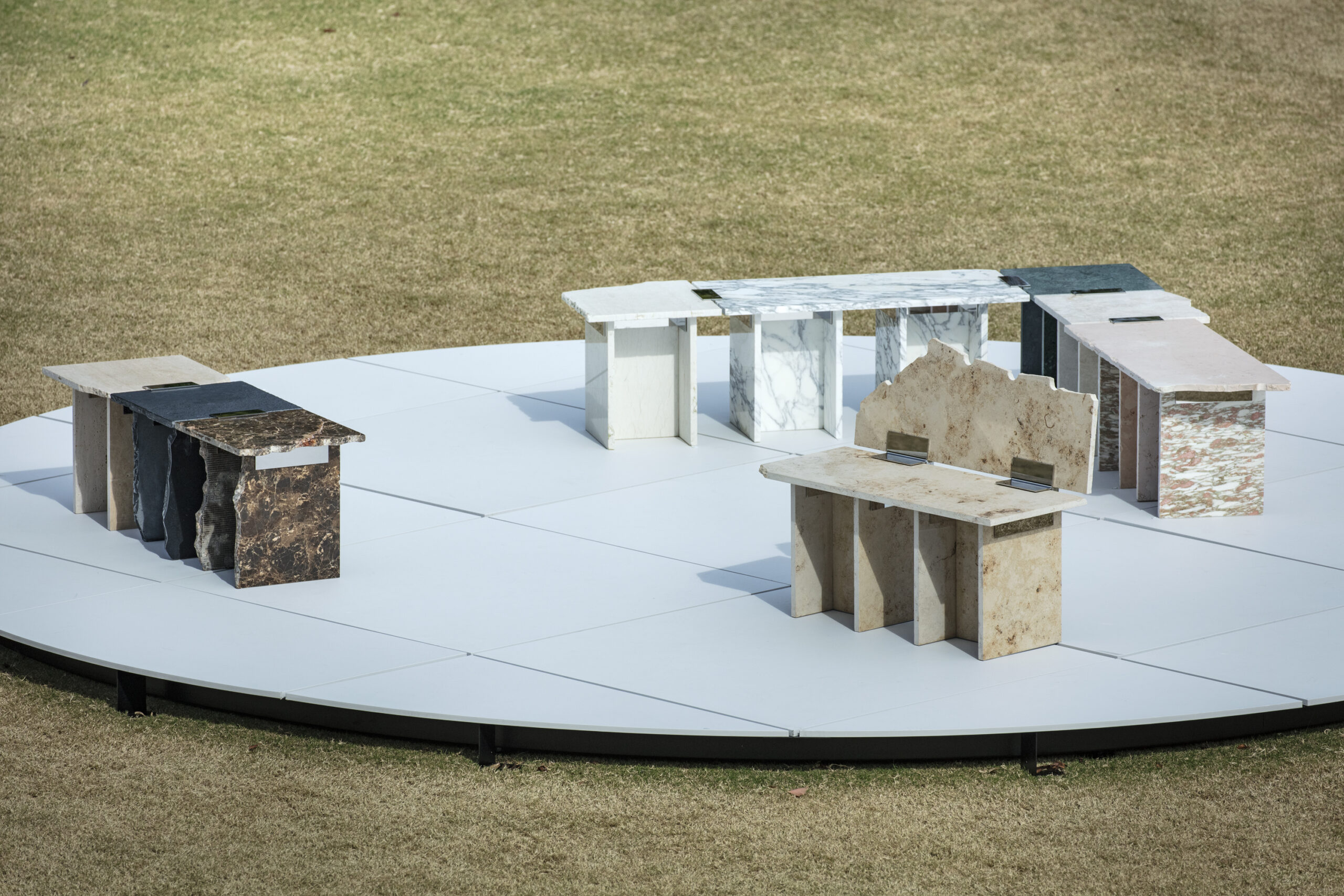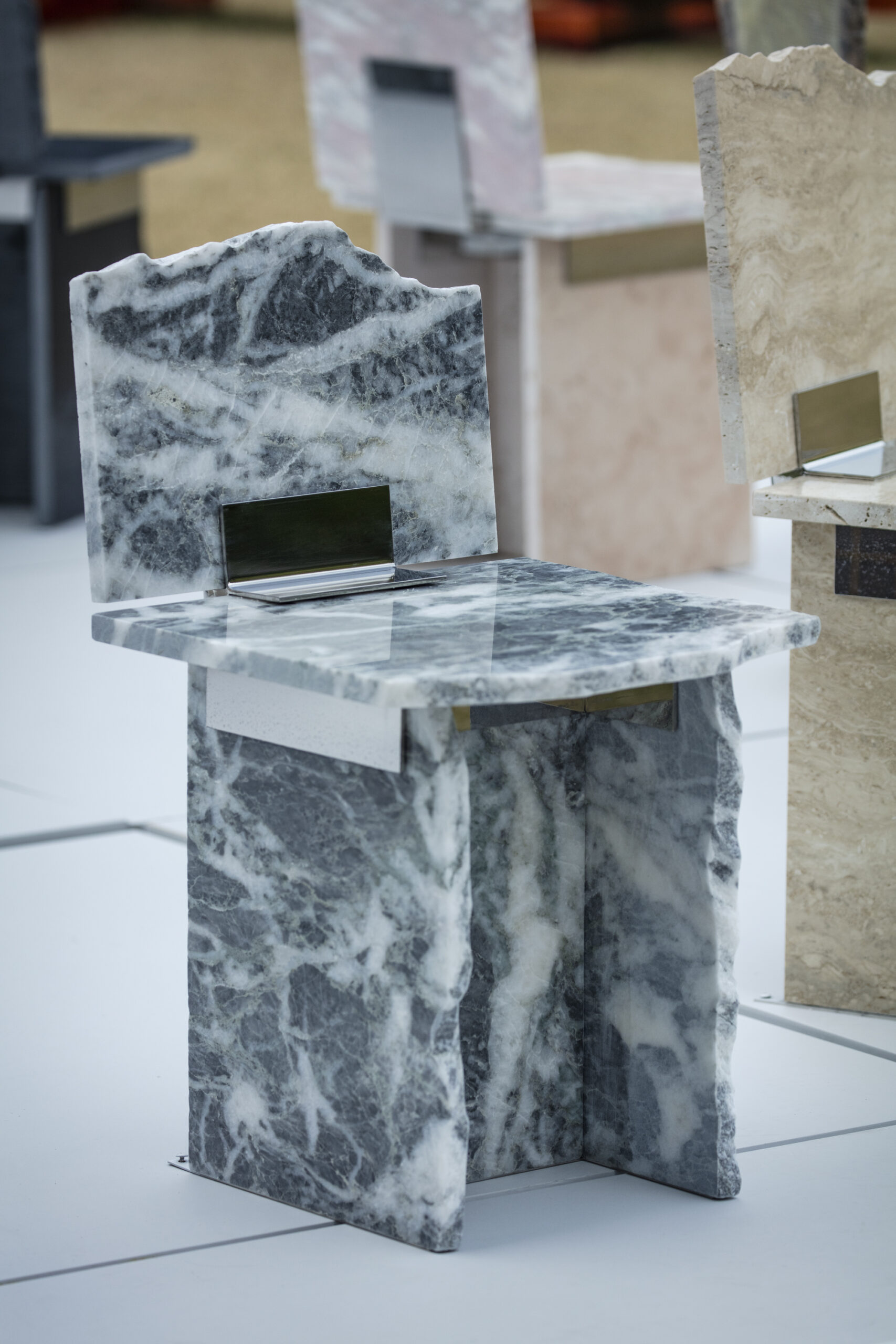 SUR+PLUS is a project that asks how surplus materials generated within systems of production might be received rather than treated as waste — and how, in receiving, different things can coexist. The ordering system of “required quantity + a few percent” is a form of risk management widely used across many fields of production, not only in interior construction. To prepare for damage, miscounts, delivery errors, or the complexity of design and installation, a few percent of extra material is added to the required quantity. As a result, materials inevitably remain unused after construction as surplus. Surplus, therefore, is not accidental; it is embedded within the system of production itself. Materials commonly used in interior construction – such as stone, wood, tiles, and carpet — each possess different thicknesses, textures, and background narratives. In SUR+PLUS, these fragments are inserted into joint components, transforming them into structural roles such as seats, backs, and legs. In this way, SUR+PLUS becomes a system through which a chair can be formed without cutting new material. Connections, or joints, have long been an important theme in architecture and design, often developed as techniques for precisely connecting materials to produce uniform and stable structures. In SUR+PLUS, however, connection does not aim for uniformity. Fragments are bound together as they are – cracks, chips, and traces of time intact. What emerges is a form of coexistence — elements connected while their differences remain. At the same time, the concept of connection invites a reconsideration of relationships – between people and people, people and objects, and objects and objects. In SUR+PLUS, the joint components do more than physically connect materials. They also connect the narratives embedded within them, along with the bodies and thoughts that engage with them. Through materials generated as surplus within systems of production, SUR+PLUS asks how different elements might be accepted as they are, and reconnected while holding their differences. In doing so, the project reveals what production structures often overlook, and proposes one possible form of coexistence in contemporary society, where diverse cultures and materials intersect.