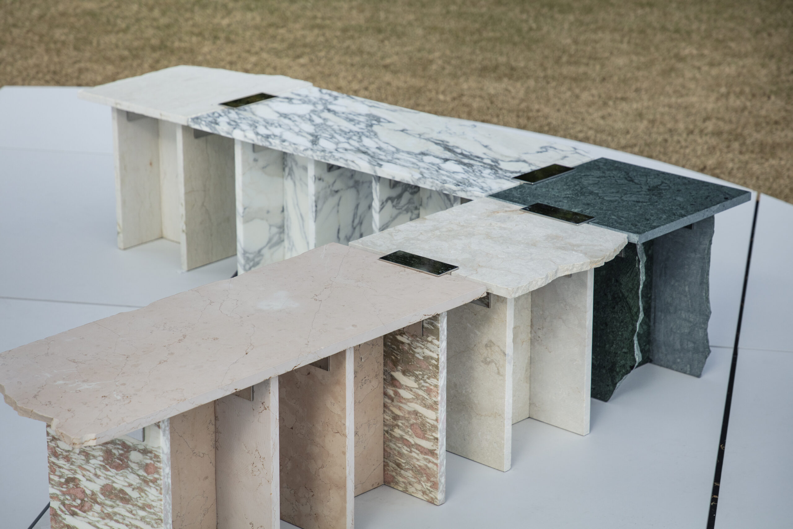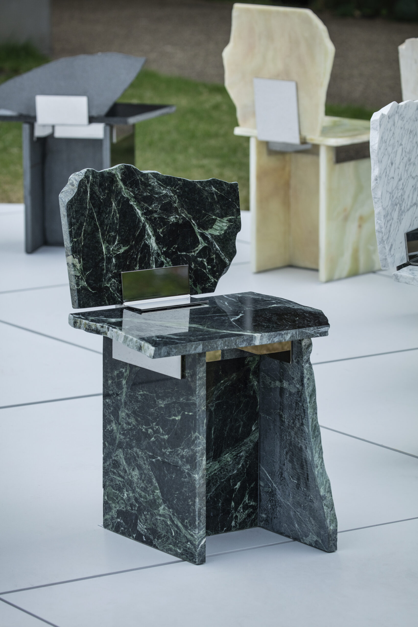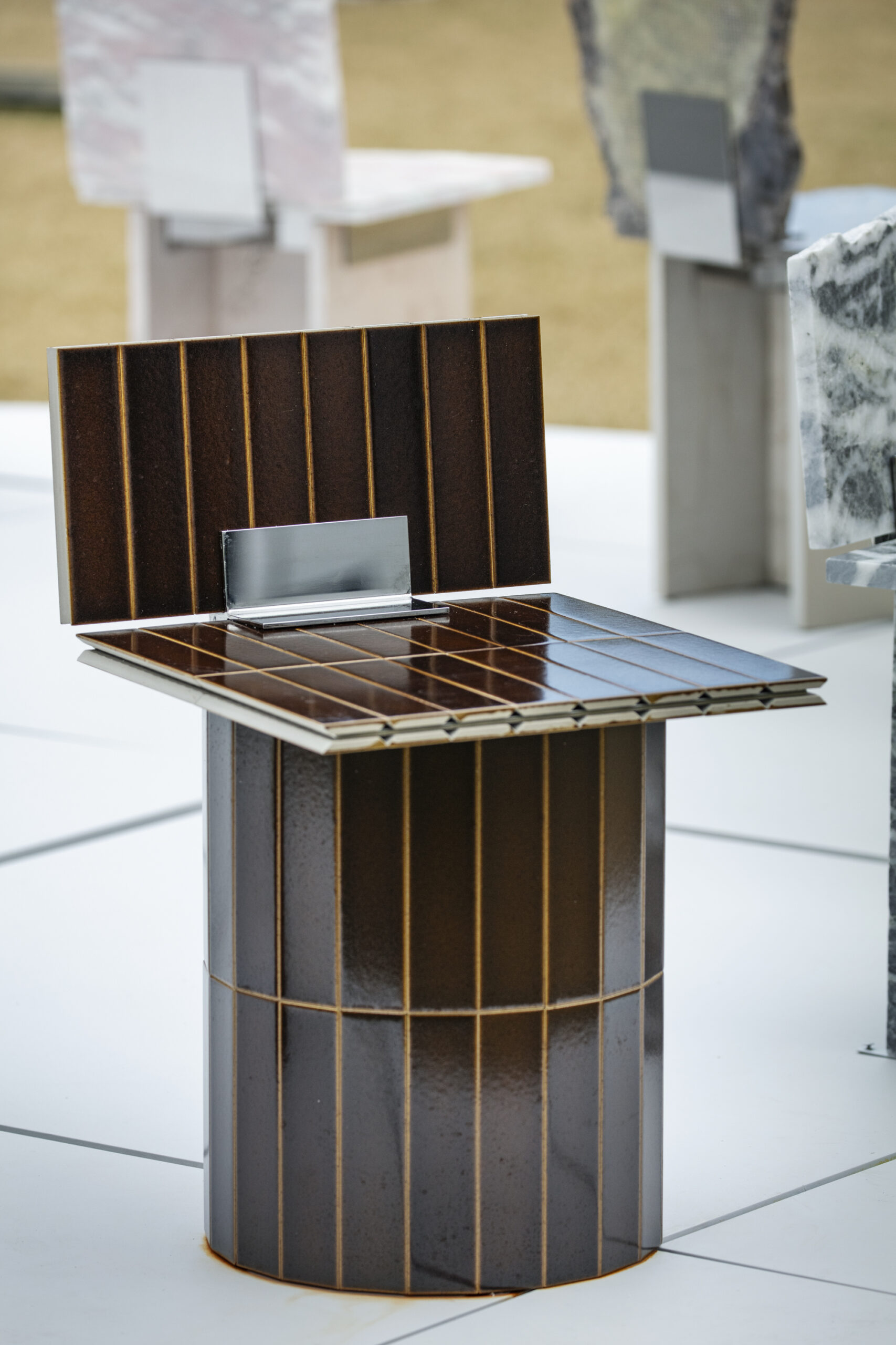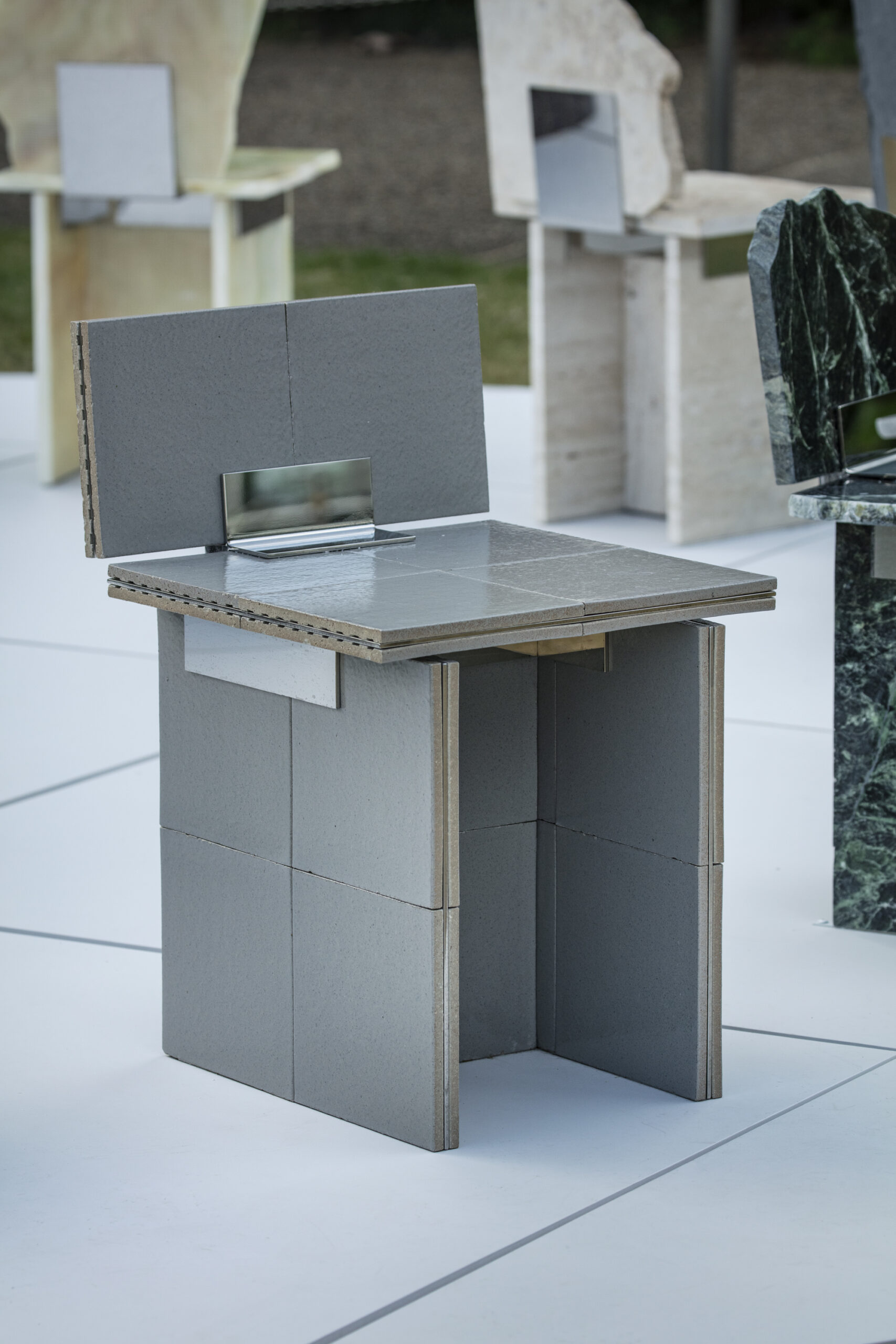 SUR+PLUS is a project that asks how surplus materials generated within systems of production might be received rather than treated as waste — and how, in receiving, different things can coexist. The ordering system of “required quantity + a few percent” is a form of risk management widely used across many fields of production, not only in interior construction. To prepare for damage, miscounts, delivery errors, or the complexity of design and installation, a few percent of extra material is added to the required quantity. As a result, materials inevitably remain unused after construction as surplus. Surplus, therefore, is not accidental; it is embedded within the system of production itself. Materials commonly used in interior construction – such as stone, wood, tiles, and carpet — each possess different thicknesses, textures, and background narratives. In SUR+PLUS, these fragments are inserted into joint components, transforming them into structural roles such as seats, backs, and legs. In this way, SUR+PLUS becomes a system through which a chair can be formed without cutting new material. Connections, or joints, have long been an important theme in architecture and design, often developed as techniques for precisely connecting materials to produce uniform and stable structures. In SUR+PLUS, however, connection does not aim for uniformity. Fragments are bound together as they are – cracks, chips, and traces of time intact. What emerges is a form of coexistence — elements connected while their differences remain. At the same time, the concept of connection invites a reconsideration of relationships – between people and people, people and objects, and objects and objects. In SUR+PLUS, the joint components do more than physically connect materials. They also connect the narratives embedded within them, along with the bodies and thoughts that engage with them. Through materials generated as surplus within systems of production, SUR+PLUS asks how different elements might be accepted as they are, and reconnected while holding their differences. In doing so, the project reveals what production structures often overlook, and proposes one possible form of coexistence in contemporary society, where diverse cultures and materials intersect.