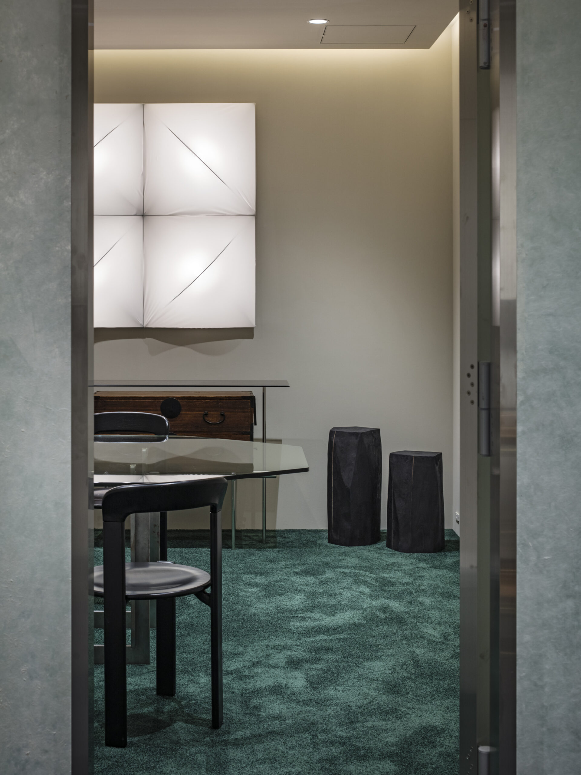 Rather than simply selecting from the standard material palettes offered by manufacturers, we have visited factories, such as, domestic soil wall, Washi paper with soil mix with, domestic thinned wood and hazardous tree left on the site , custom made tiles made from prototype and discarded tiles as raw materials, and glazed with molten slag produced by Japan’s waste treatment technology called “melting furnaces,” which reduces and detoxifies large volumes of waste generated from households and factories, tiles glazed with volcanic ash, tiles made from lava stone, and tiles made from limestone, Japanese bio-vegan leather upcycled from wood powder generated at domestic cypress processing plants, carpets from ECONYL, a nylon fiber that can be regenerated repeatedly from waste, and egg paint made by blending eggshells from food production process with diatomaceous earth, recycled gypsum board made entirely from waste gypsum board, and offcuts or reclaimed stones that suppose to be discarded at stone factory. Furthermore, for the glass block flooring, we adopted an installation method that does not use any adhesives, enabling blocks to be reused in the future without becoming industry waste. We also incorporated white lacquer, a material that evolves over time and is rooted in traditional Japanese urushi lacquer techniques. This approach deepened our own understanding of the materials and also led to a greater awareness of societal challenges, issues, and recycling systems, and allowed us to reflect these insights in our design.