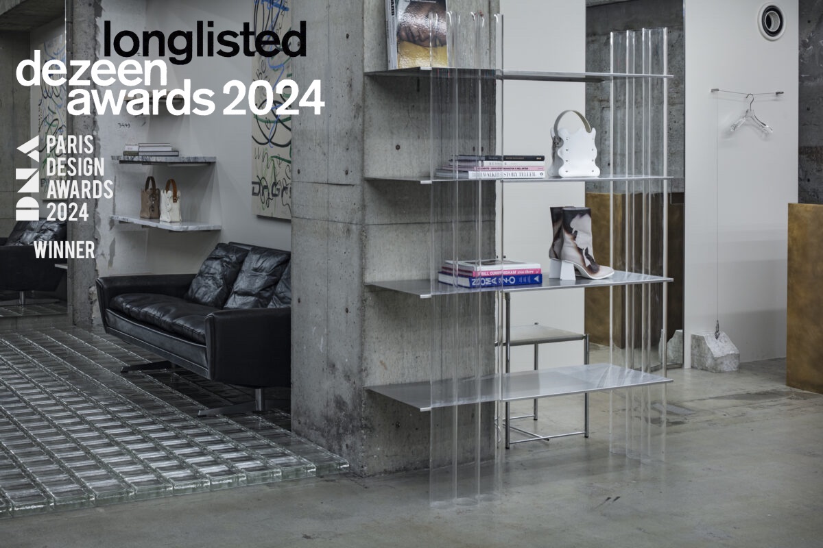丸型のアクリパイプや歪みのあるガラスブロックを店内に計画。アクリルパイプやガラスブロックを通して空間や商品は歪みを見せる。