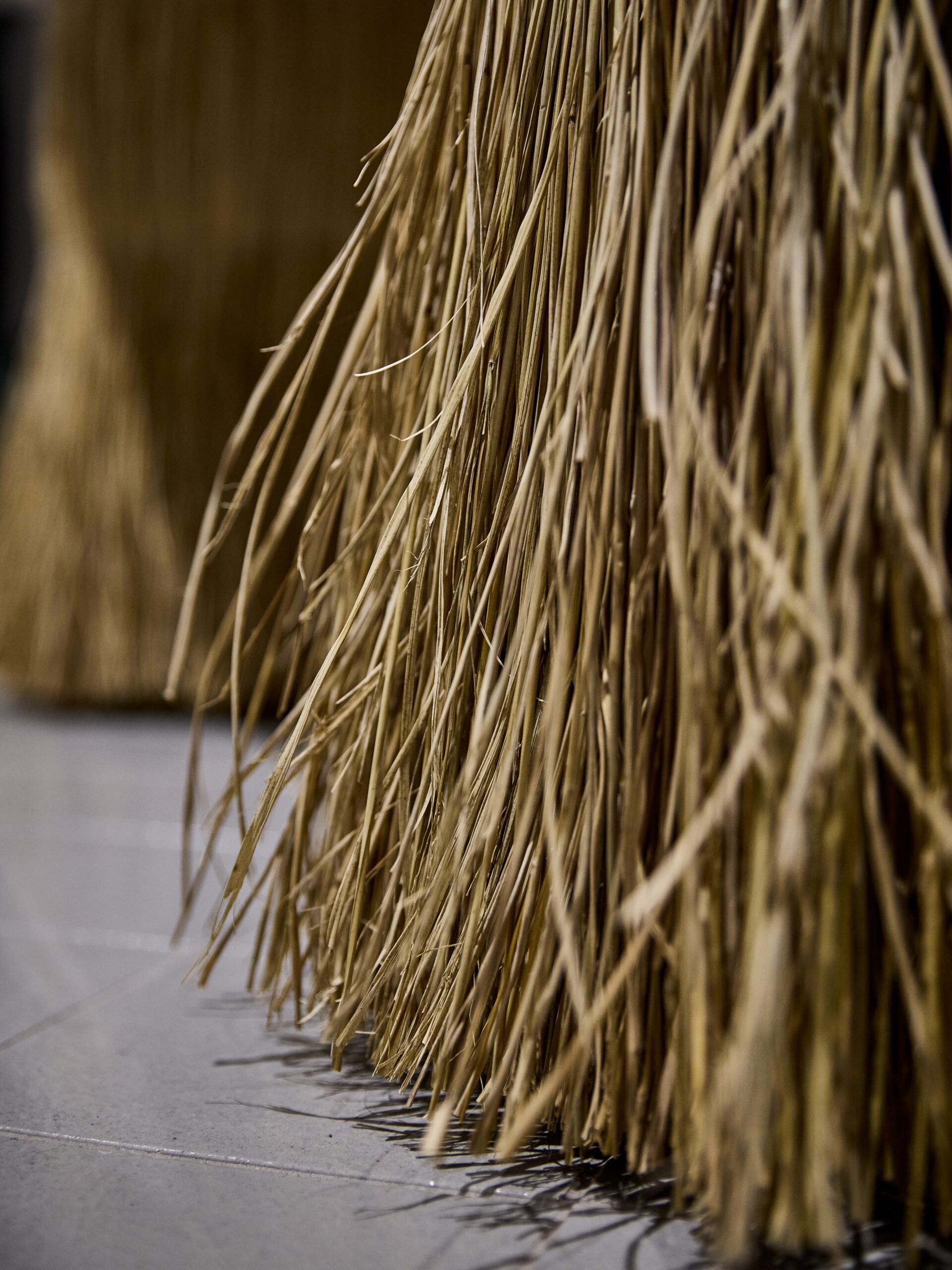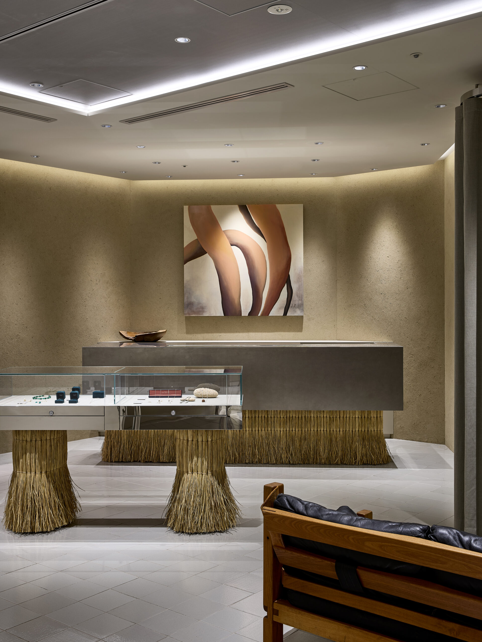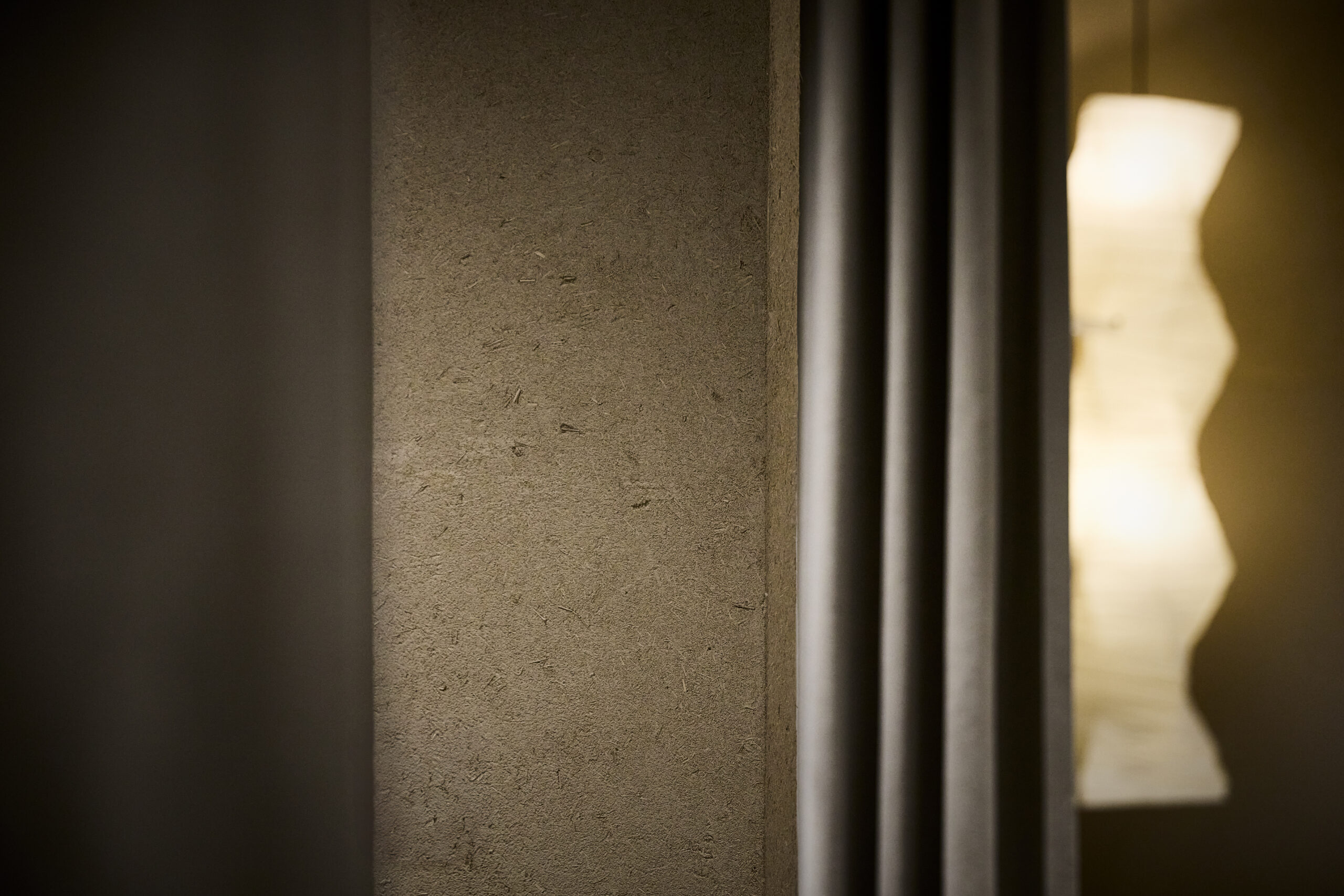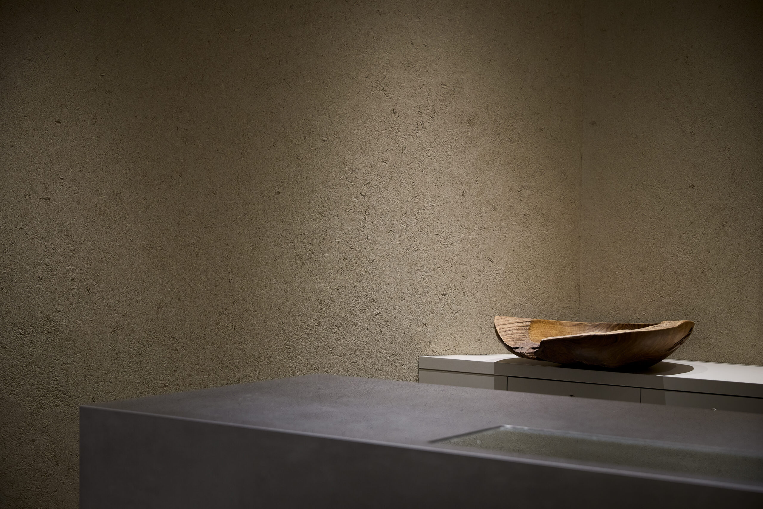 まず、日本の食文化には欠かせない米からヒントを得て、米の副産物である藁を、米を育む土に練り込んだ土壁を採用した。加えて、テーブル、ショーケース、レジカウンターにも藁をデザインとして取り入れている(藁はstraftによる)。