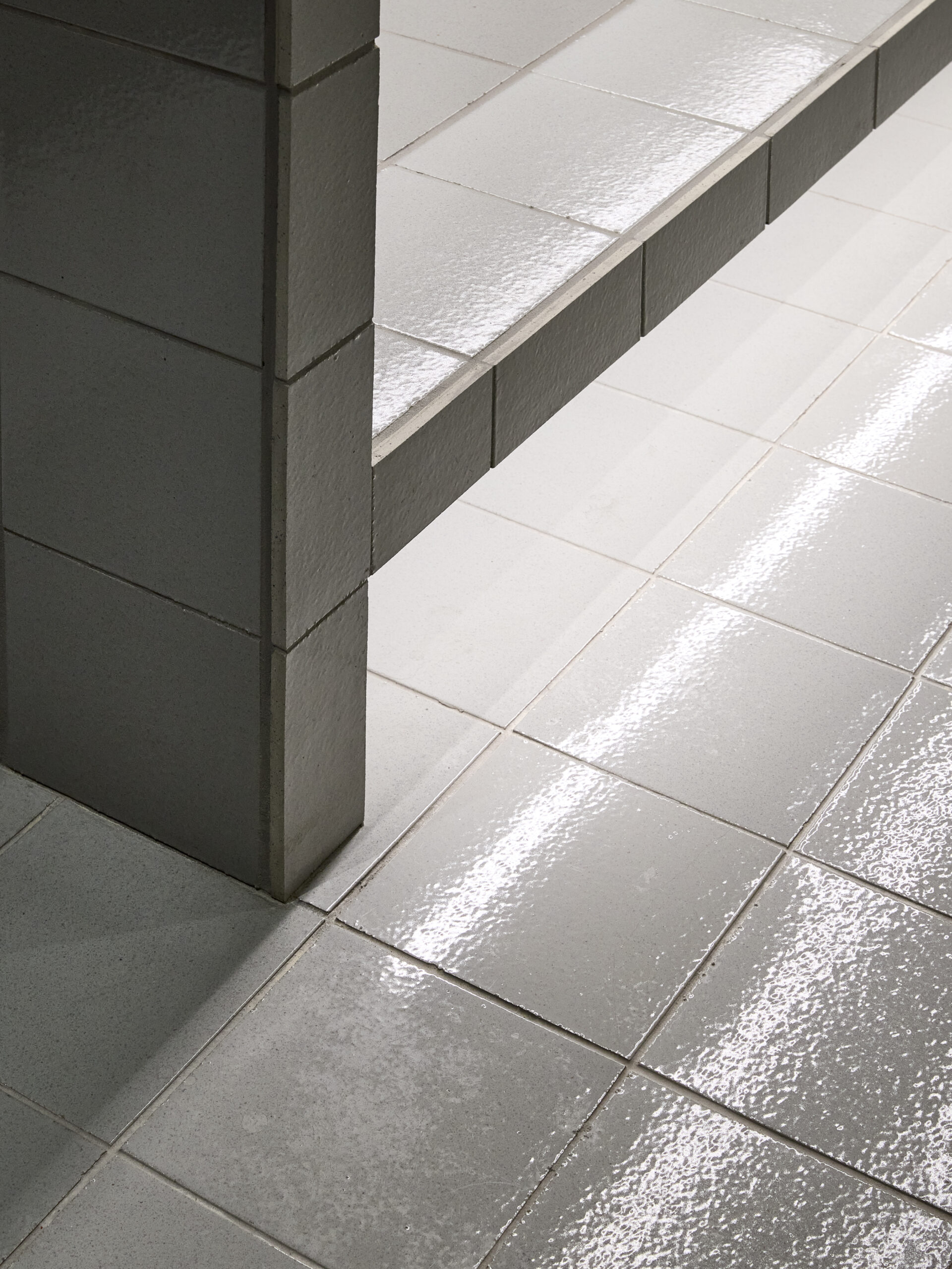 陶器やタイルは、土を原料とする建材ですが、今回の床やファサードに使用しているタイルは使用済みの廃棄タイルを原料とし、さらに一般家庭ゴミを処分する溶融炉から排出されたスラグを釉薬として使用している。そのほか、間伐材を使用したスツールや、木造住宅の解体現場から発生した柱を使用したローテーブルなども店内に配置された。